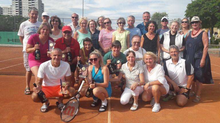 Und dann wäre da noch das Wetter: bei Gegenwind wurde der Tennisball noch ins Feld gedrückt und bescherte einen überraschenden Punkt, während Bälle mit dem Wind beinahe der Sonne entgegen segelten. So sorgte das windige Wetter noch für zusätzliche Heiterkeitserfolge für die ohnehin schon gutgelaunten Paarungen. Nach fünf Runden und den Endspielen mit den bestplatzierten Damen und Herren gab es leckere Sachen vom Grill angereichert mit selbstgemachten Salaten und Desserts und Bier vom Fass.