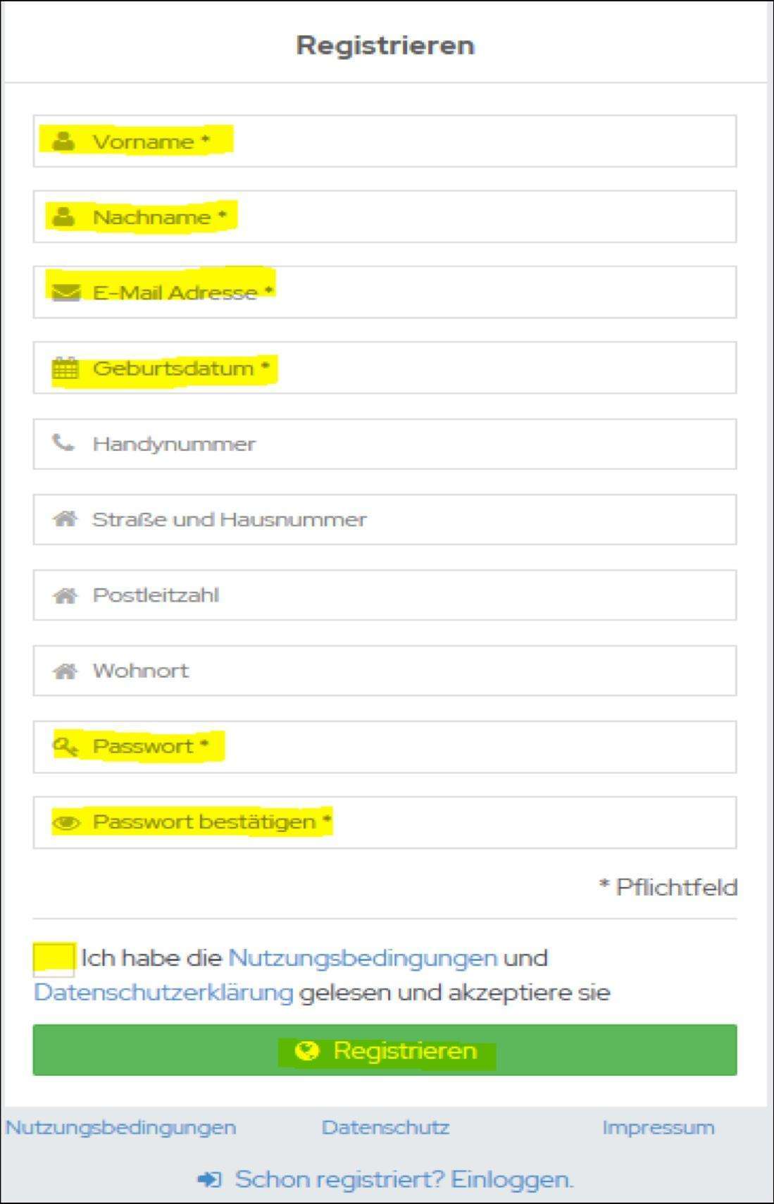 Andere Felder (ohne*) sind freiwillig und müssen nicht eingetragen werden. Die Daten (Vorname, Name, Geburtsdatum) müssen so wie im Mitgliedsantrag eingegeben werden (Spitznamen oder Abkürzungen werden vom System nicht angenommen).